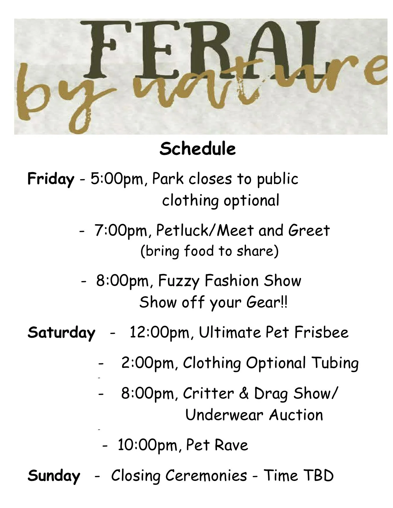 Feral by Nature-Tent or small poptop Campsite $110.00 3 day adult camping weekend for furries!! Add to cart Feral by Nature - 1 day ticket $60.00 Add to cart Puppy Party - RV Site $160.00 RV site to enjoy this 3 day camping party for puppy people!! Add to cart